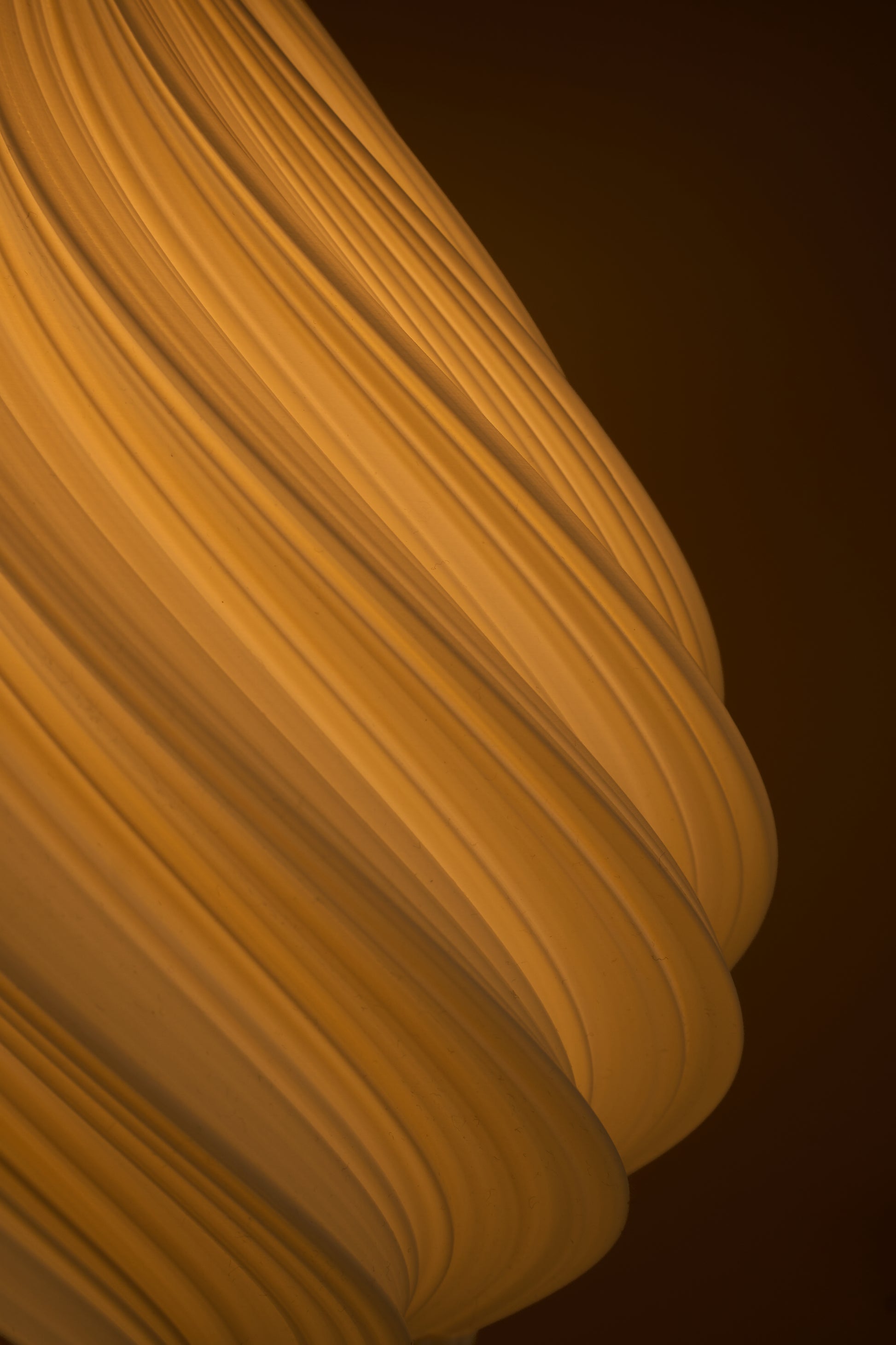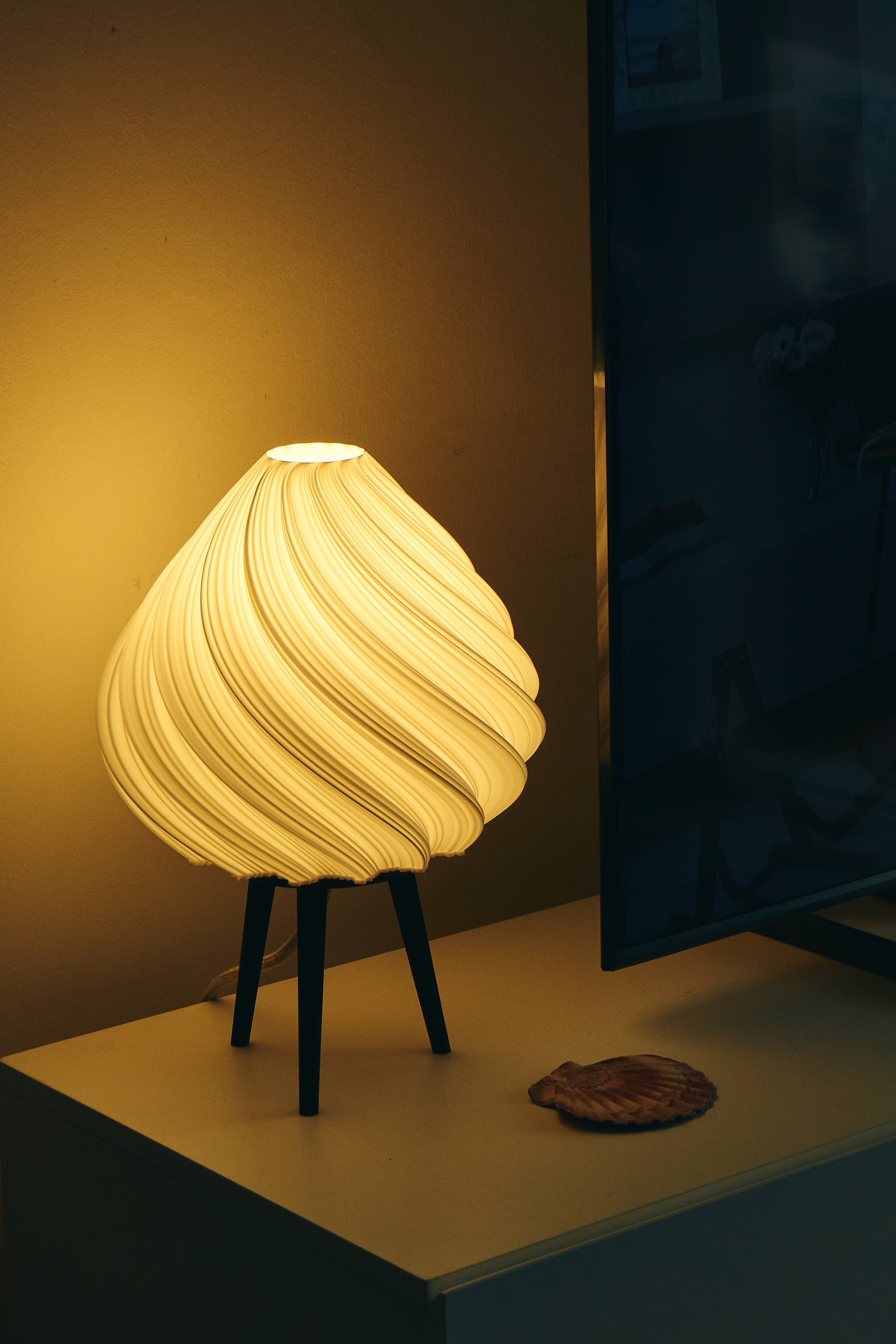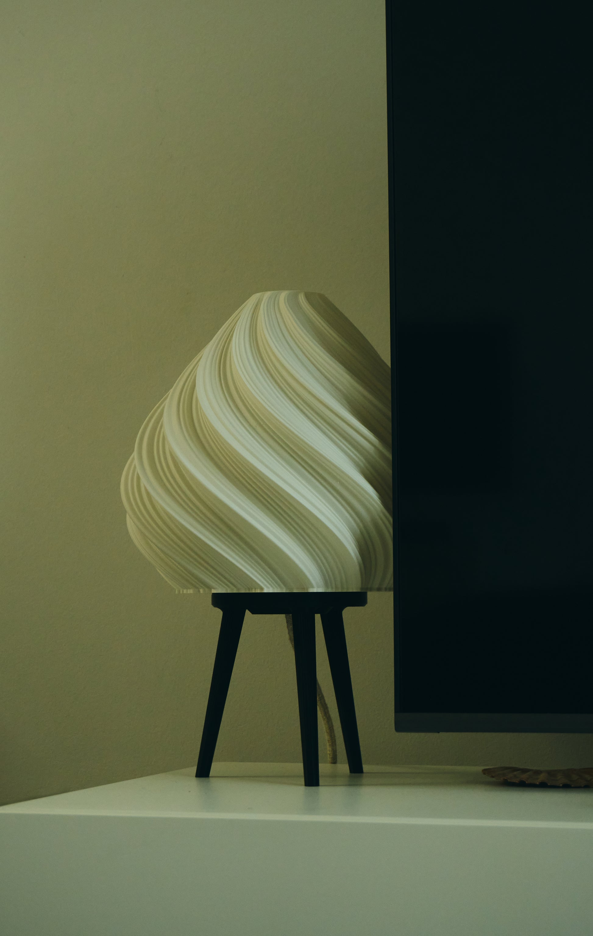 Ideal para mesas de apoio, estantes ou mesas de cabeceira. Queríamos criar um modelo que mantivesse a leveza e o caráter artesanal da Lume Waves, mas que também fosse compatível com smart bulbs, permitindo novas formas de interação com a luz. Por isso, neste modelo, optámos por não incluir o dimmer tradicional e adotámos um casquilho E27, ampliando as possibilidades de personalização luminosa (smart bulb recomendada, não incluída).